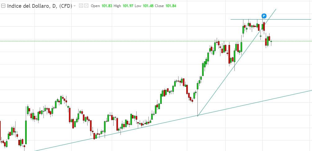 Dal punto di vista grafico, la fase di indebolimento del dollaro americano si evince anche analizzando il grafico daily del Indice del Dollaro, l’indice che misura la forza del green back rispetto ad un paniere delle maggiori valute tradate, il quale al momento si è allontanato dai massimi storici raggiunti a fine 2016 ed al momento staziona sotto il livello 102,00 ed esattamente a 101,86.
