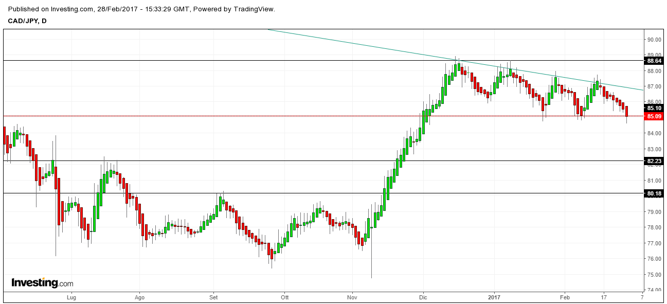 Discorso molto simile graficamente anche per NZD/JPY mentre, il calendario economico, non ci riserva particolari appuntamenti su queste due valute in questa settimana.