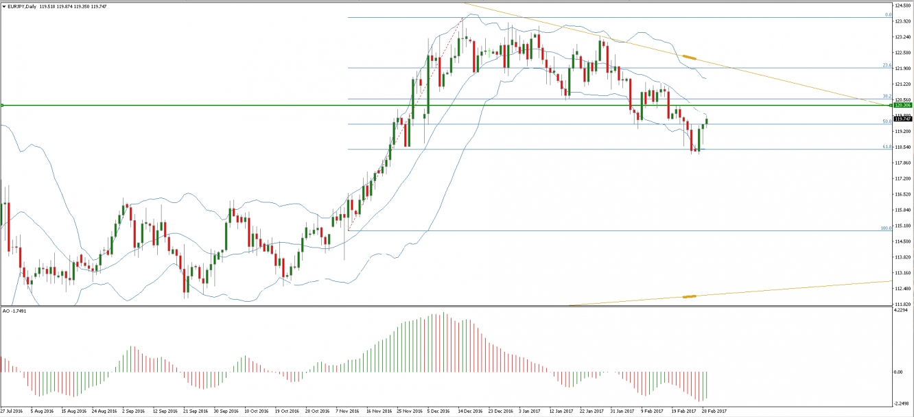 EUR/JPY continua a salire all’interno di un’onda d’impulso minore rialzista, iniziata quando la coppia ha invertito al rialzo dall’area compresa tra il livello di supporto 118.20, la lower Bollinger band e il ritracciamento di Fibonacci del 61.8%% relativo all’impulso rialzista del mese di novembre. L’inversione dalla zona ha creato il pattern giapponese Morning Star. EUR/JPY dovrebbe proseguire la salita fino al prossimo target buy al livello di resistenza 120.30.